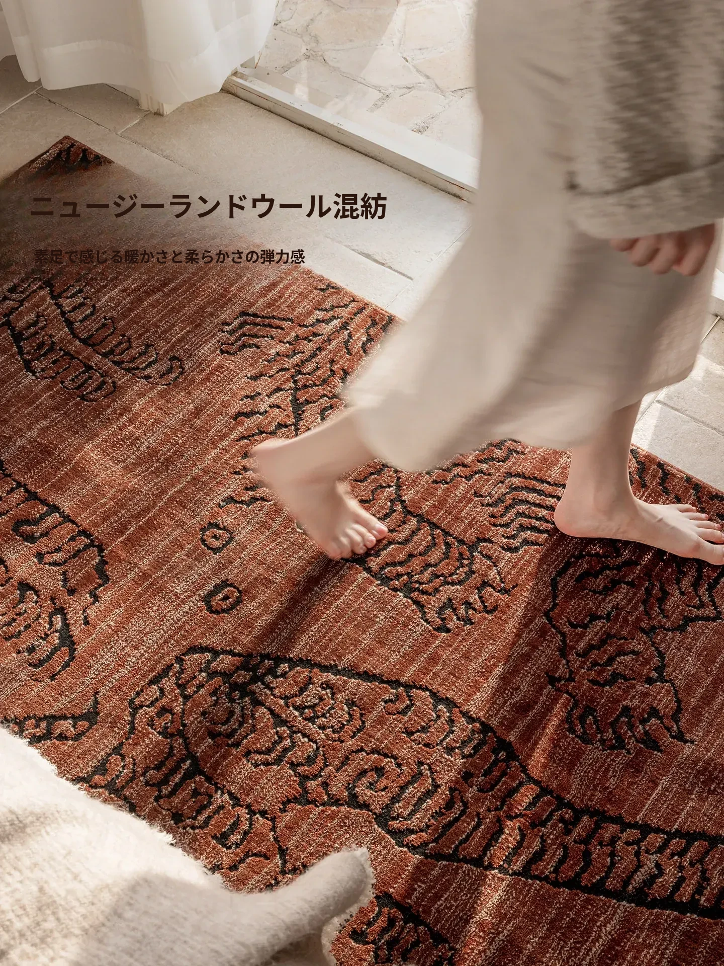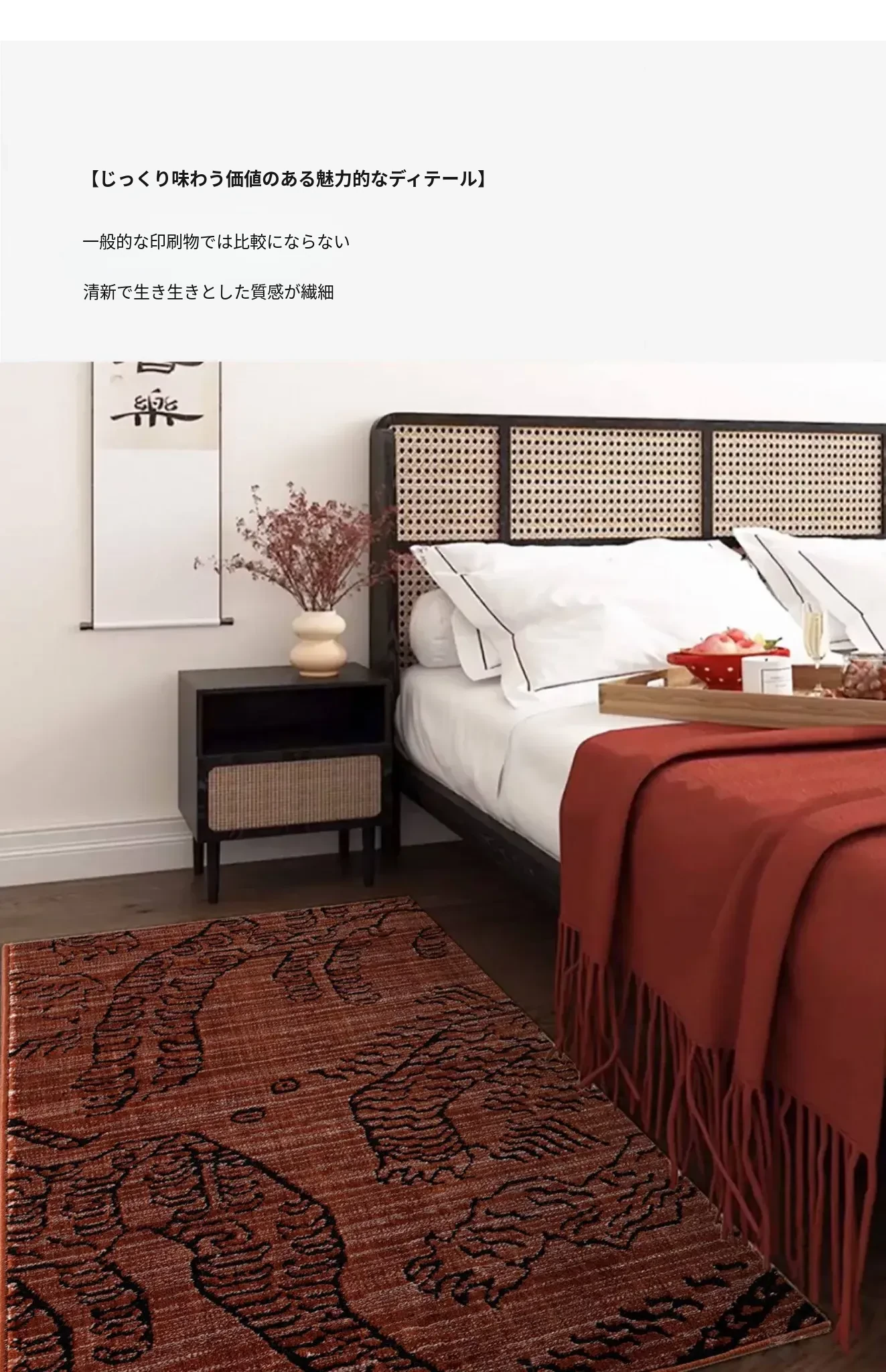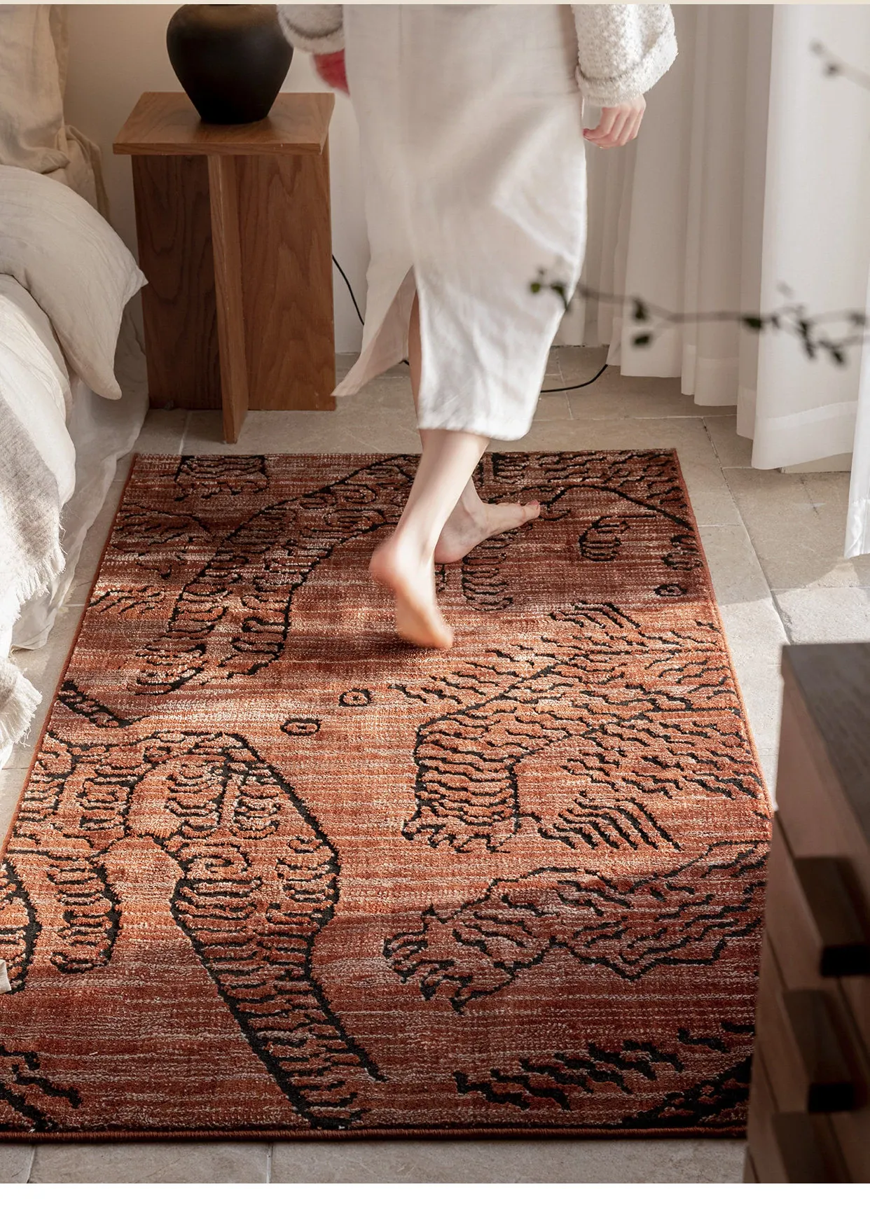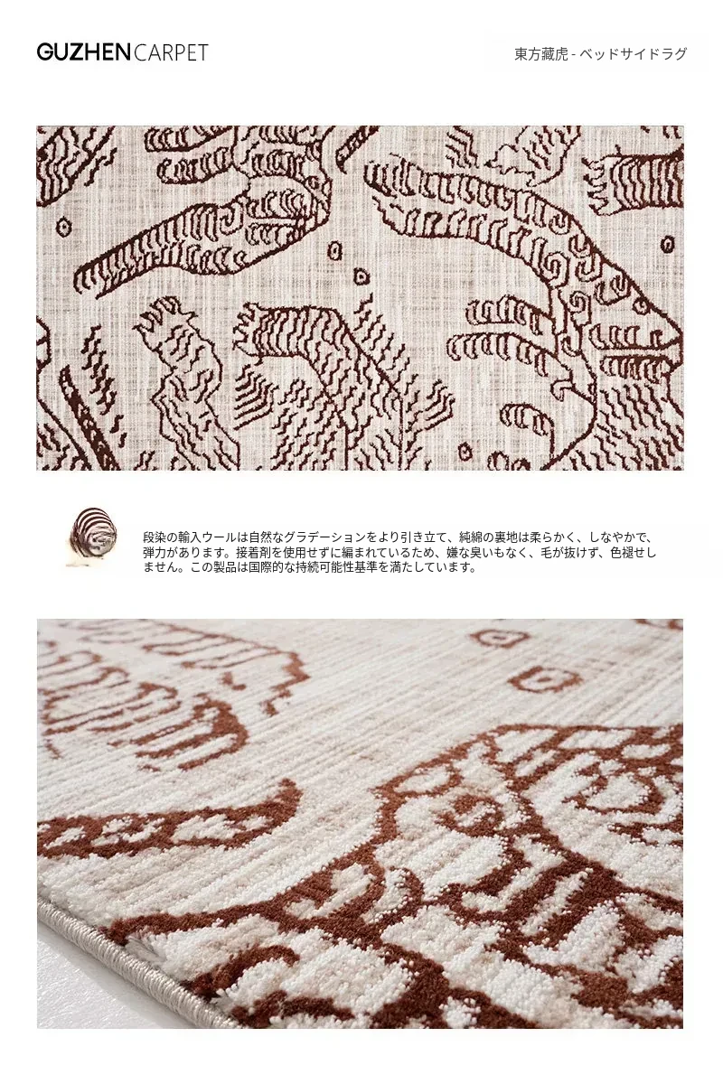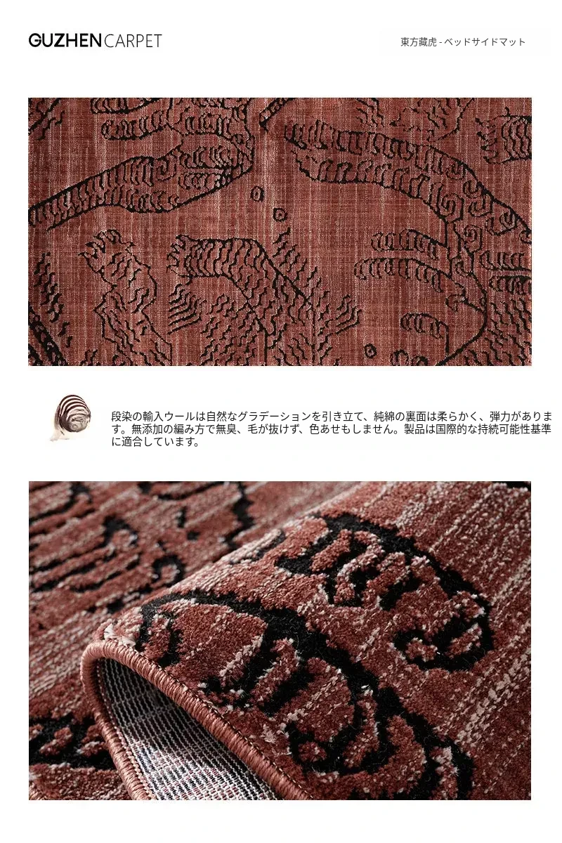 古典東方の虎デザイン、ラグジュアリーなヴィンテージレッドのウールラグ。接着剤不使用で、リビングやメラードの寝室にぴったりな高級感あふれるカーペット。