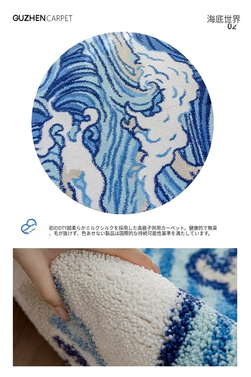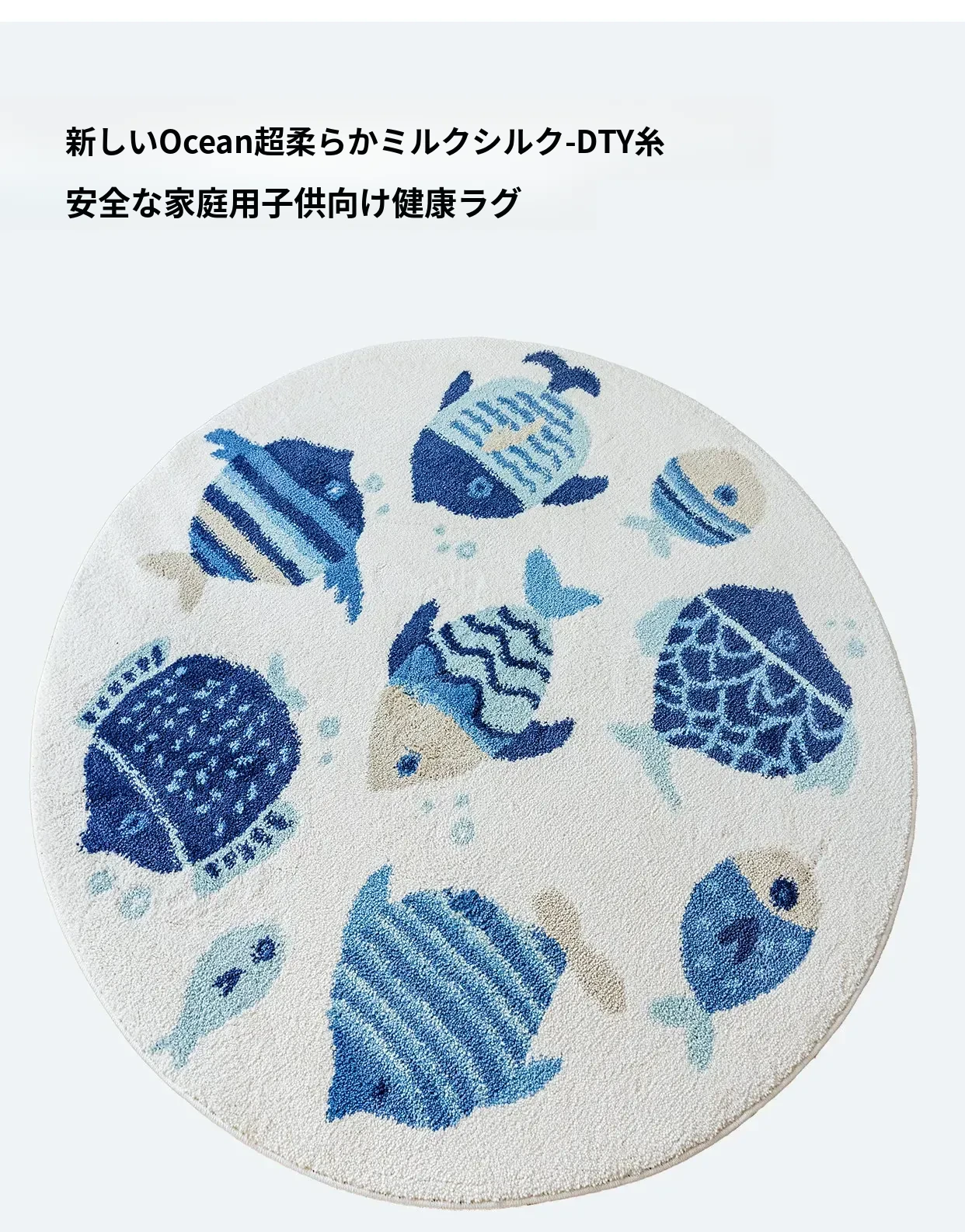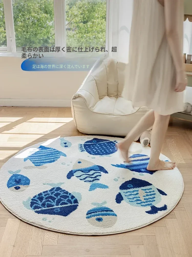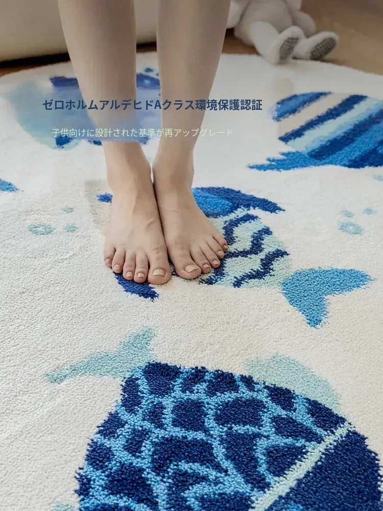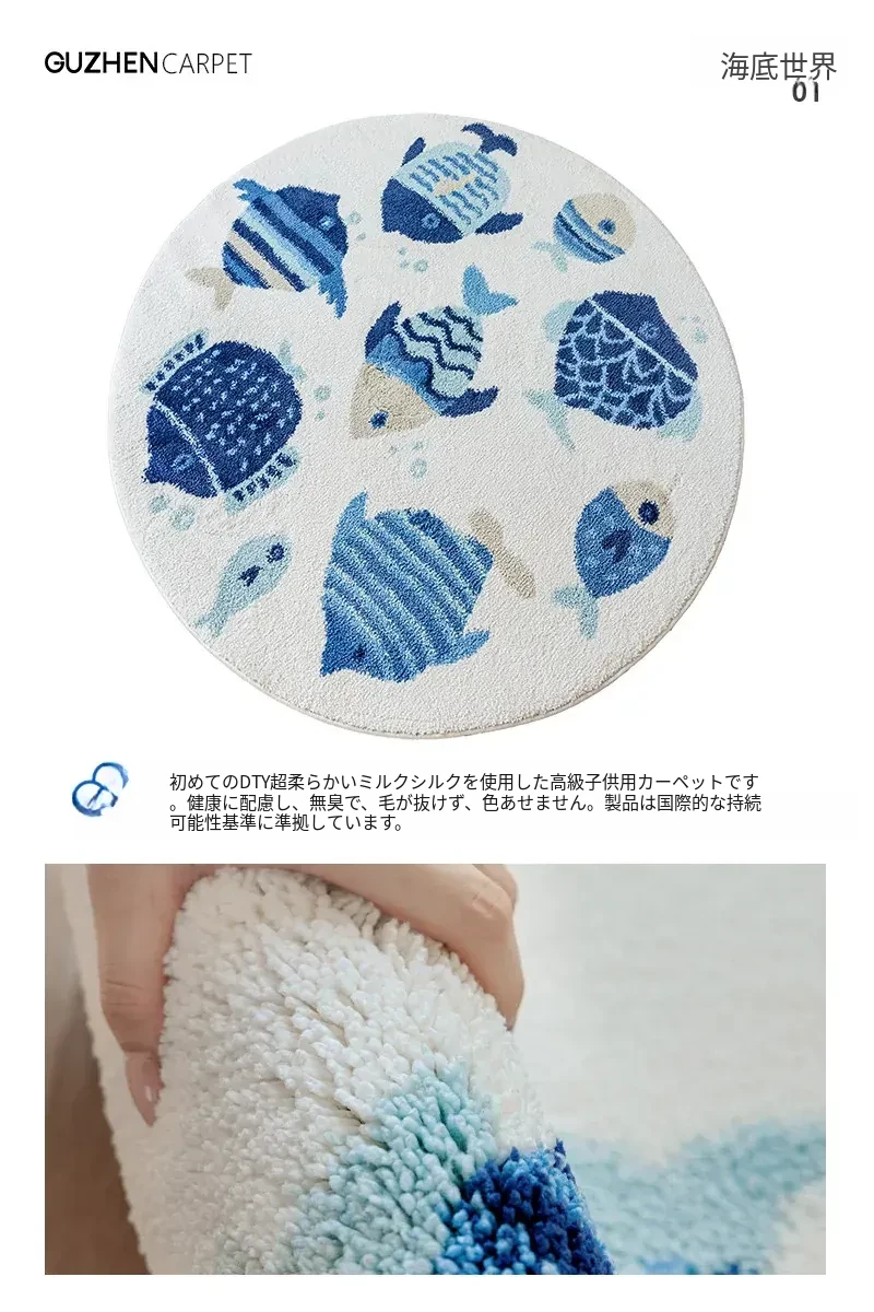 海の世界をテーマにした子供用カーペット|可愛らしい丸型デザインで、冬のベッドサイドにぴったり!厚手ミルクシルク素材で、ふわふわの暖かさをお届けします。お子様の夢の世界を演出するアイテムです!