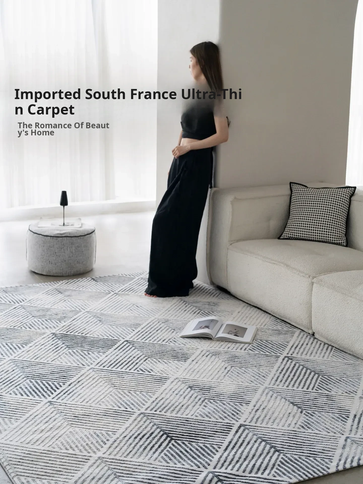 Elegant Minimalist Living Room Essentials: Italian-Designed Modern Sofa, Chic Carpet, and Cozy Bedside Rug for a Touch of Luxury.