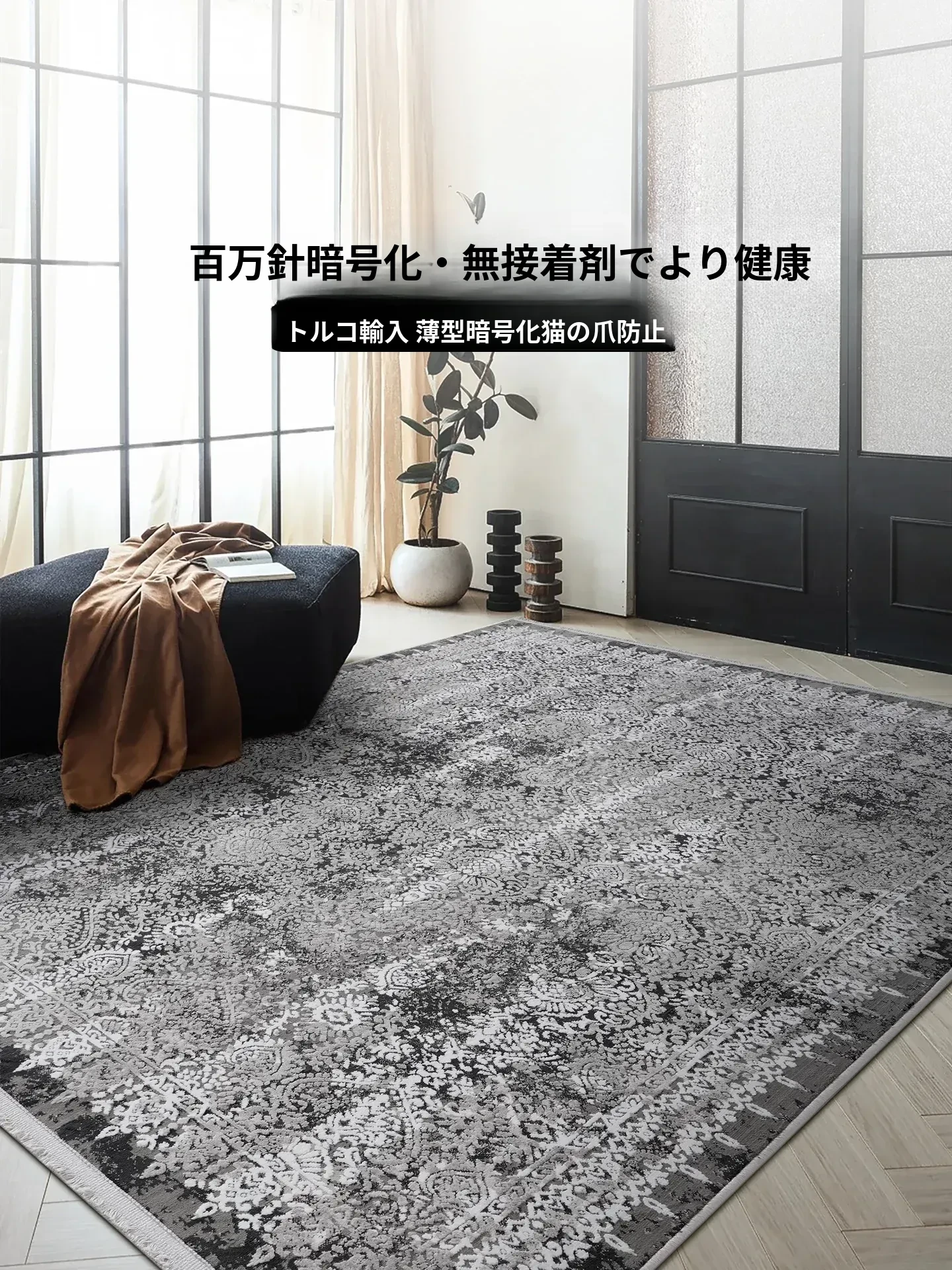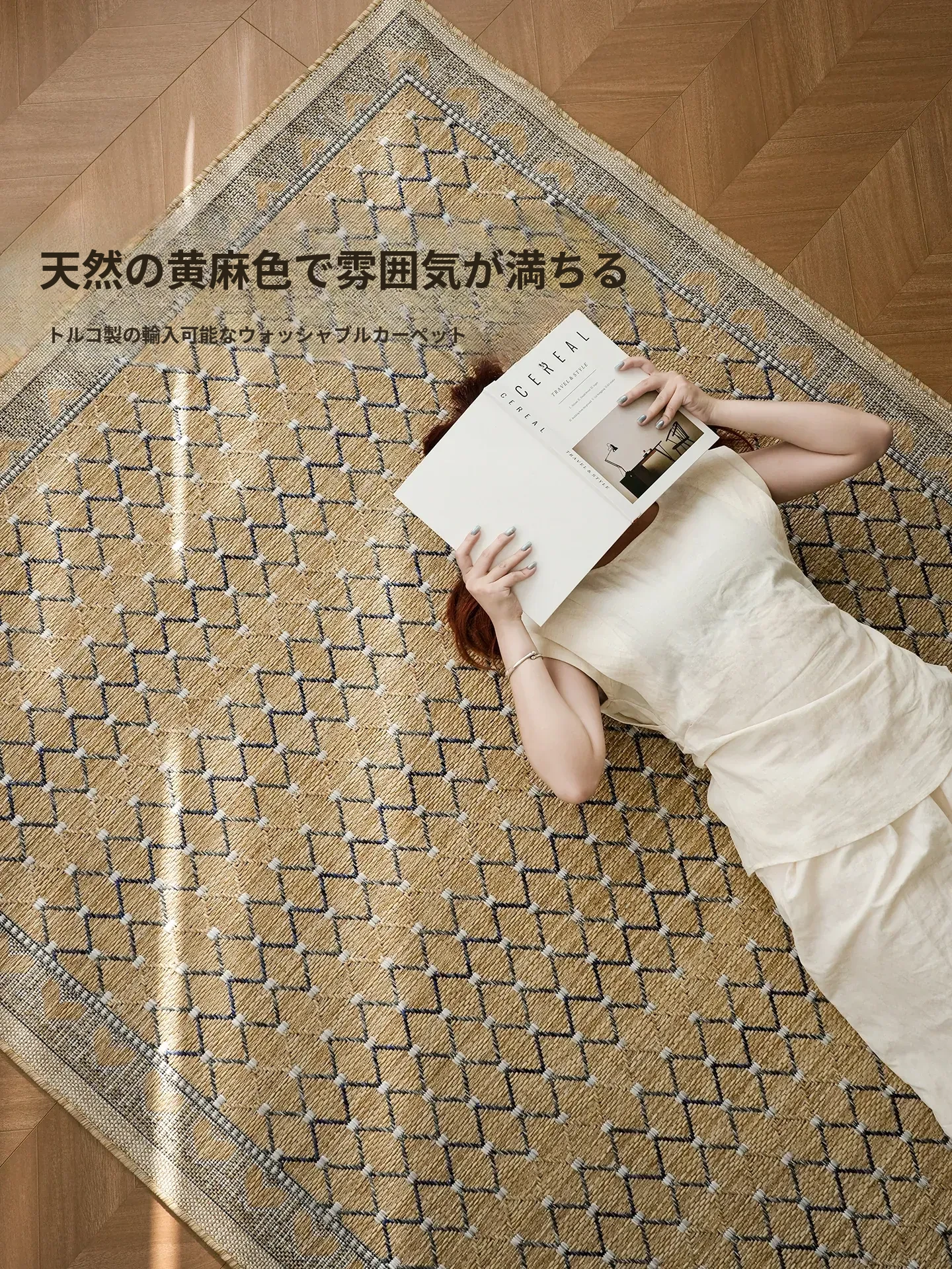 輸入薄手中古風カーペット丨高級感溢れるリビング・ベッドルーム用、接着剤不使用の擬麻素材、洗濯可能でアウトドアにも最適、汚れに強い!